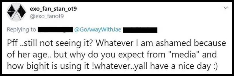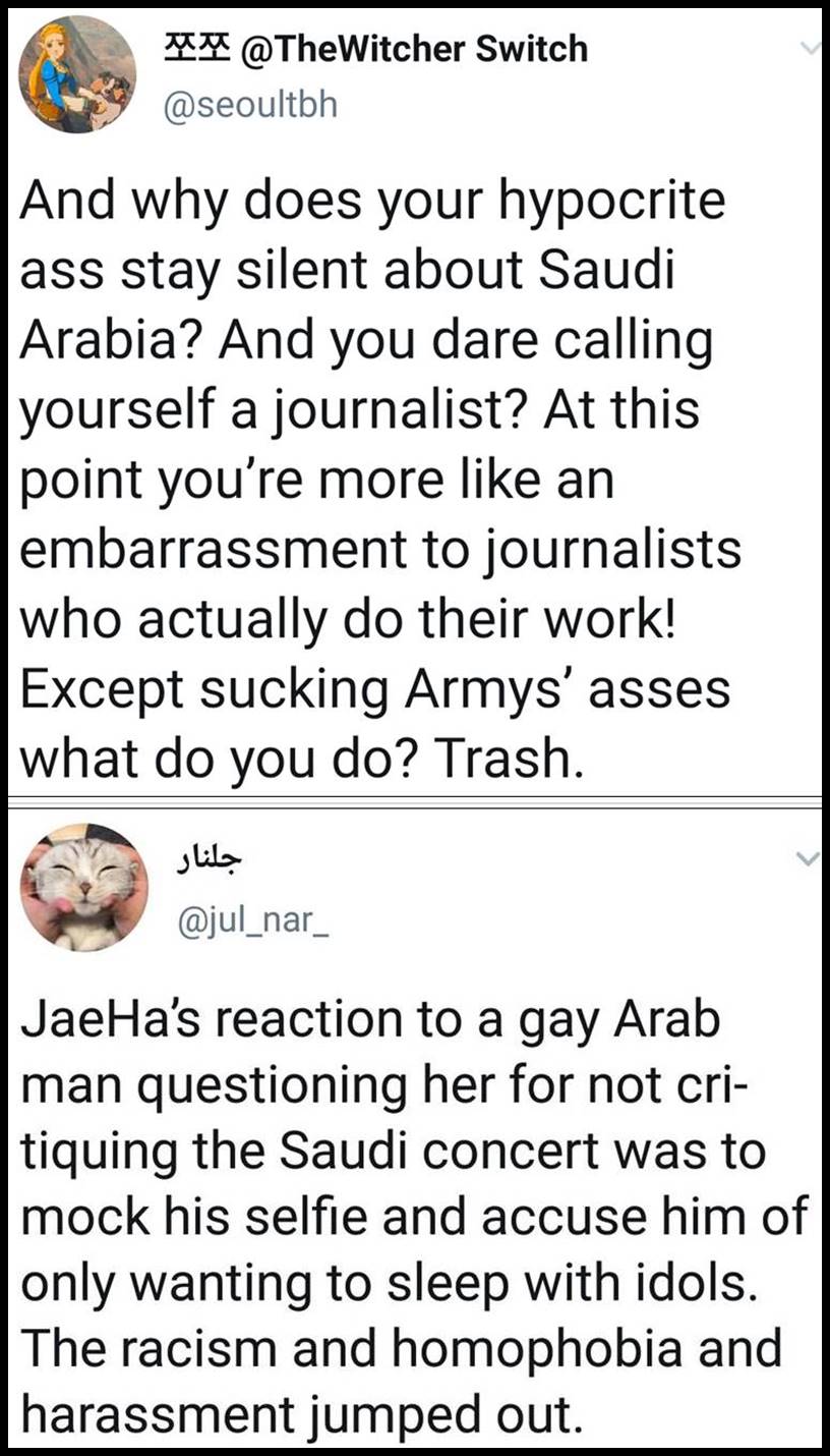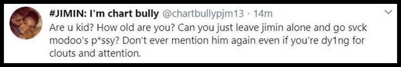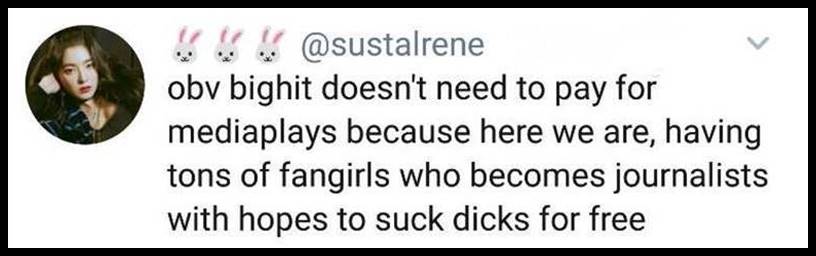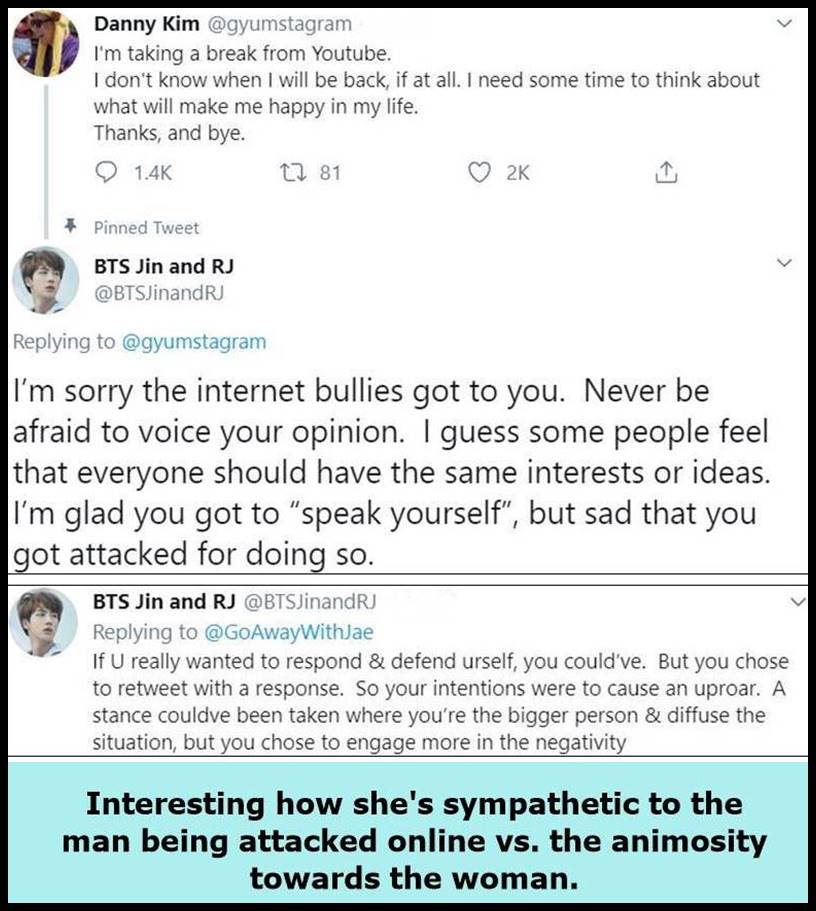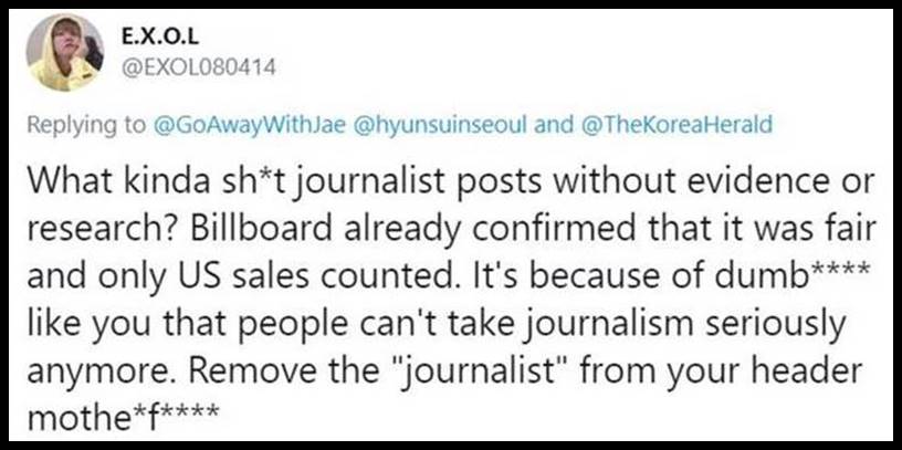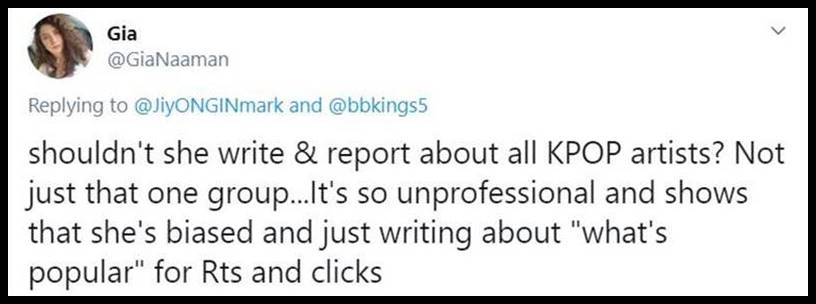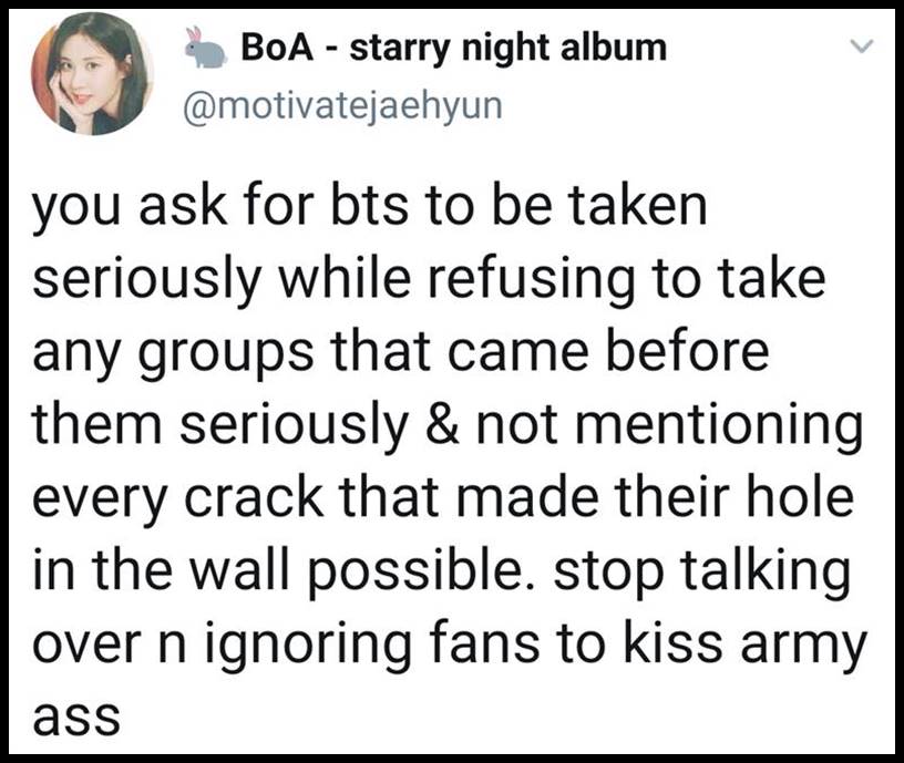 1. If she had made an error, it would be one thing if they politely pointed it out. But these bitches aren’t pointing out mistakes. They have a different opinion and want Ms. Kim to do what they want which is to agree with them. These stans are some of the most stupid people I have ever encountered. They cannot think for themselves and will do whatever their leader says. All of them are the same. All the fandoms are toxic. This is one reason why so many people don’t want to have anything to do with K-pop. The groups are Ok for what they are but the fans overall are the worst.