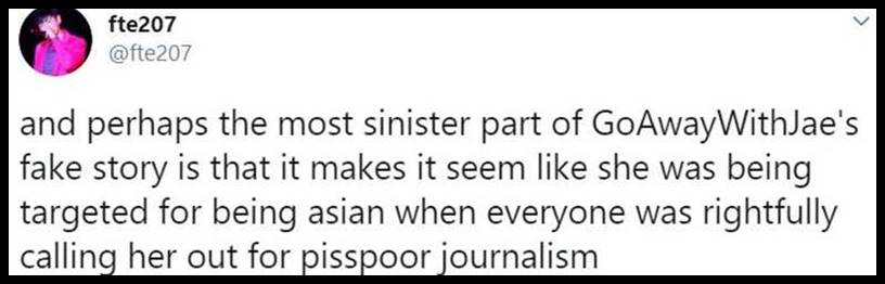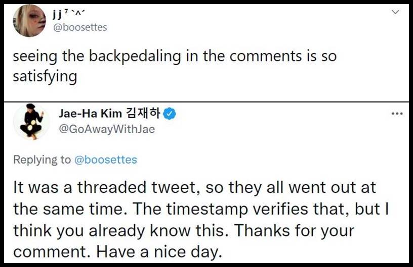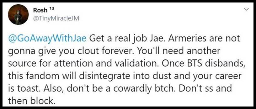 2. This is to that @angelous_pjm who is a known troublemaker on the bird app. All of you start this shit and then claim to be the victims. I’ve never once seen Jae ask her “minions” to attack you. I have seen your kind create lists of people who “should” be attacked. If you can’t stand behind something mean without using your own name, than you’re an ashole. Deal with it. If you have nothing to hide, then write it and show it off to your parents or teacher by sending that email and including them.