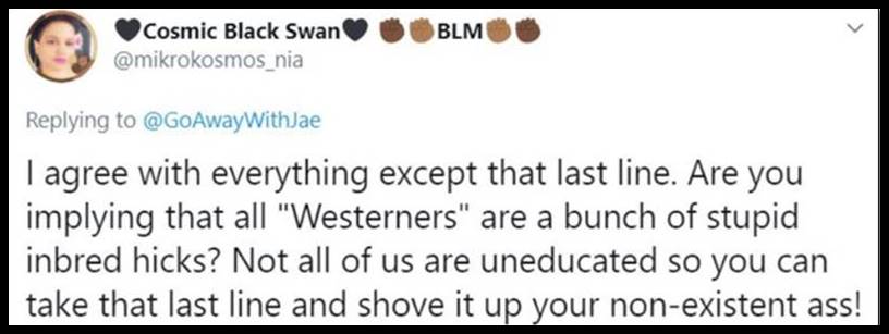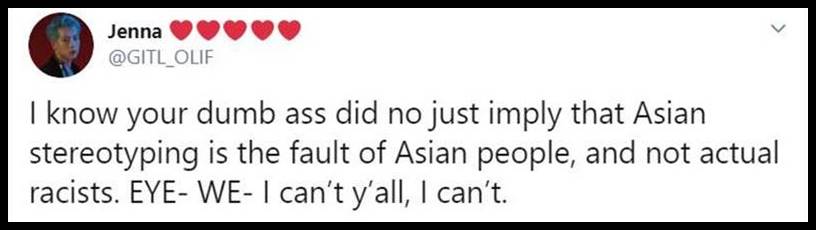 15. Why are Westerners so sensitive? That person who said “not off of us are uneducated so you can take that last line and shove it up your non-existent ass!” She needs to take a chill pill. So she’s going to cry NOT ALL WESTERNERS and then go right ahead and perpetuate the racist trope that Asian women don’t have asses? She just proved herself to be an actual ass. How ignorant.