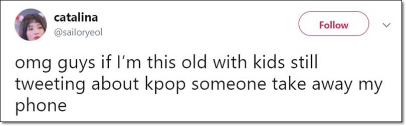 This one is my absolute favorite Mean Tweet that was directed towards me. Yes, she was making fun of my age, but I never thought I’d be tweeting about K-Pop at this stage in my life, either. She got her point across without being racist or sexist and her tweet made me laugh.