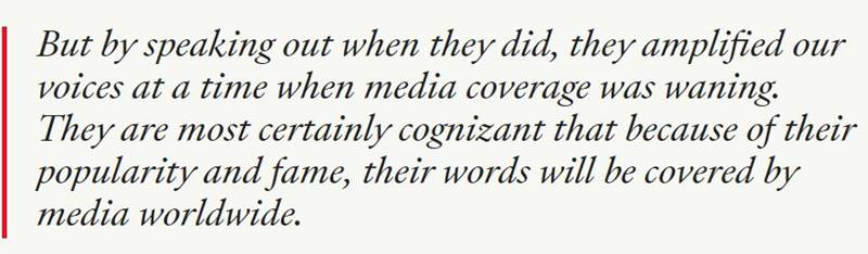 “Our own experiences are inconsequential compared to the events over the past few weeks,” they collectively wrote. “But these experiences were enough to make us feel powerless and chip away our self esteem. … We stand against racial discrimination. We condemn violence. You, I and we all have the right to be respected. We will stand together.”