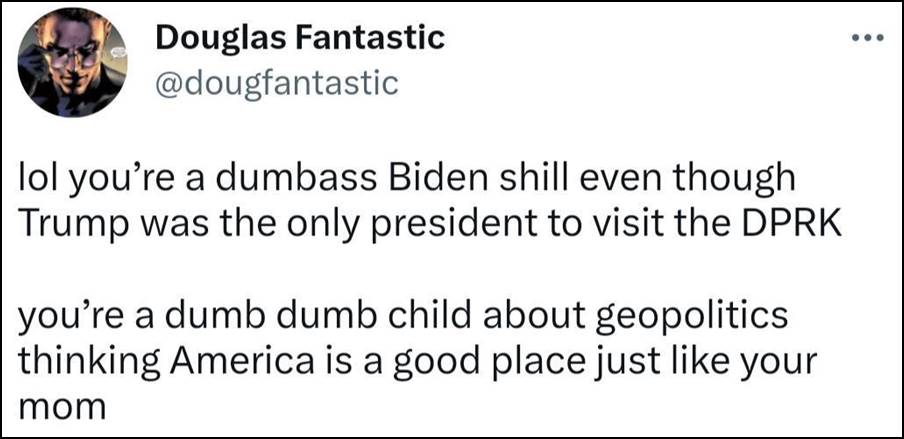 They all talk a big game (especially the 40 and 50 year olds who haven’t made it out of their parents’ suburban basements) because they read a little bit about pro juche communism and think they’re historians. Doug is the worst. We ran in the same social circles for a while, but I didn’t find him amusing after seeing how he treated women. He’s a failed actor who was pampered this whole life. He lives in California and sponges off his wealthy parents. Never worked a day in his life, which is why he has all this time to open multiple Twitter accounts specifically to harass Asian women.