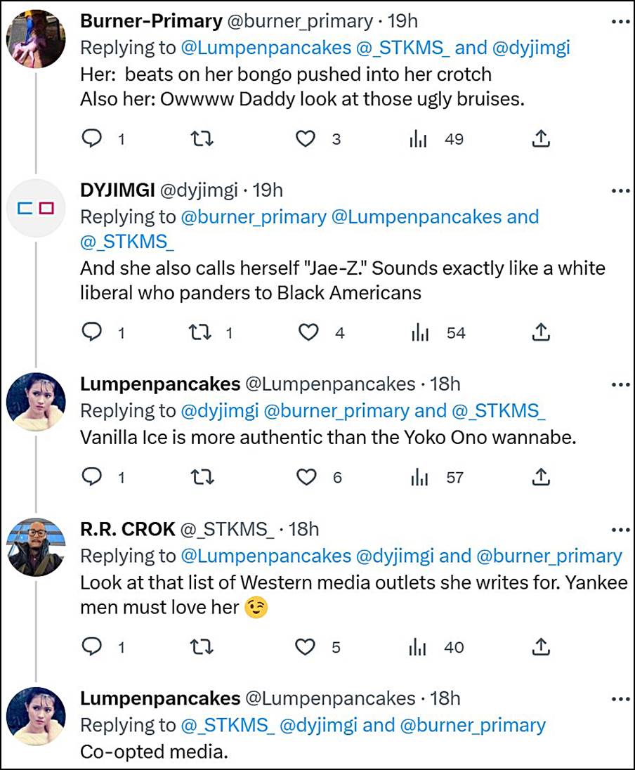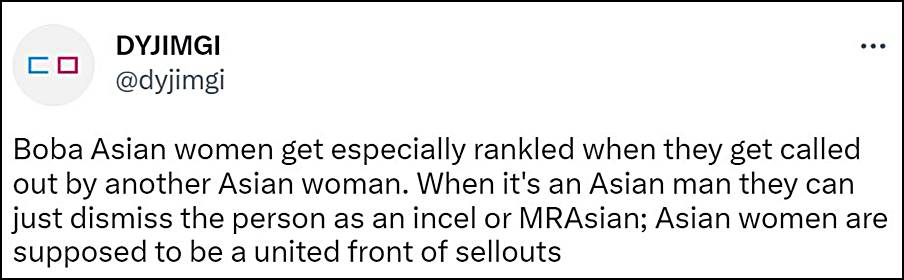 They consider an Asian American living in the United States to be a boba for working for a U.S. company? Make it make sense! Where the hell do they work? China? lol I’m sure they all work for U.S. companies. They’re jealous harpies venting a spleen because the only things they have going for them is each other.