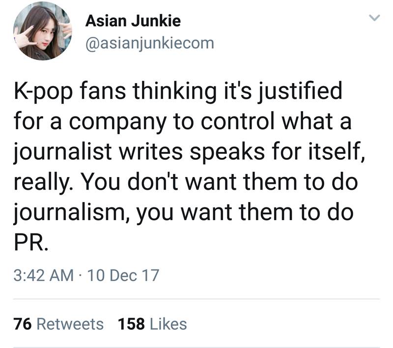 What @exo_fanot9 — whose account has long since been suspended, go figure — doesn’t realize is that Korean talent agencies court western media, specifically journalists who write for U.S. publications. Why? Because the U.S. is the world’s largest music market. There’s money to be made here.