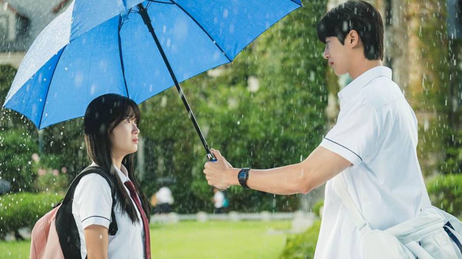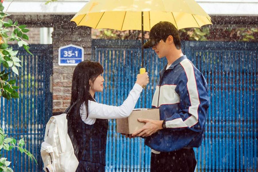 Early on, this K-drama implies that she is the one who has been besotted with him for all these years as a dedicated fangirl of his band. She was particularly touched when he (as the adult Sun-jae) cast an umbrella over her head as it snowed. In reality, he fell for her on this rainy day (depicted above). As a teenager, she had no idea who he was or that she had caught his eye. Or that she was the one who had offered him shelter first under her umbrella.