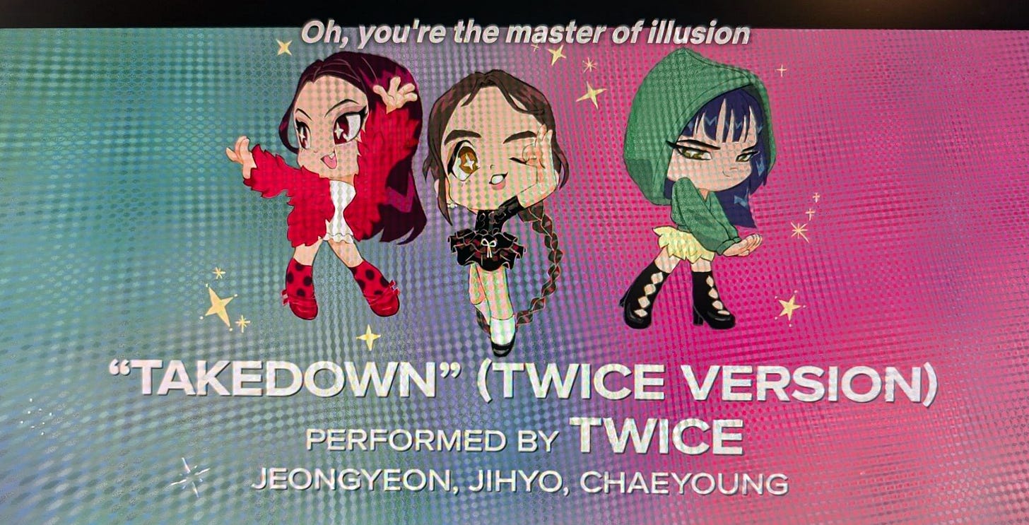 The filmmakers even recruited Jihyo, Jeongyeon, and Chaeyoung from the K-pop supergroup TWICE to sing “Takedown” (TWICE version) over the closing credits. (Notably, the real-life pop stars are the only ones to be shown on screen in non-animated form.)